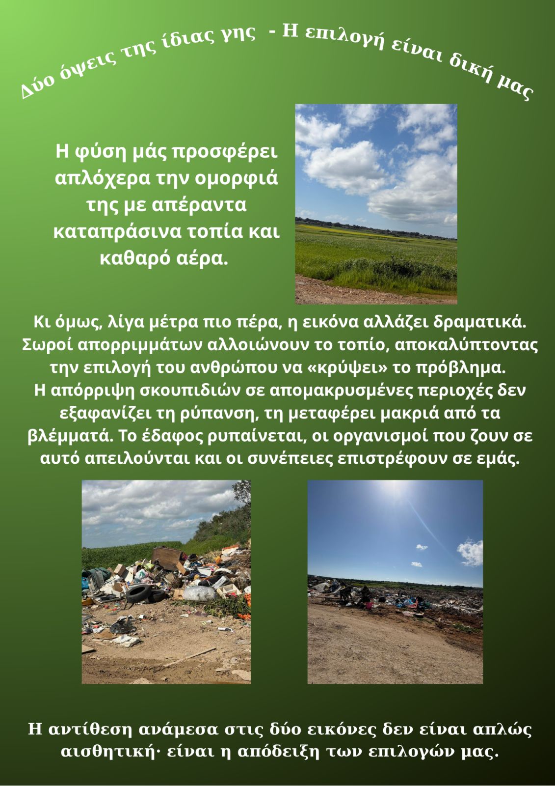 Μαθήτριες του Γυμνασίου Παραλιμνίου, στο πλαίσιο της συμμετοχής του σχολείου στο πρόγραμμα «Νέοι Δημοσιογράφοι για το Περιβάλλον: Εκπαίδευση για το Περιβάλλον και την Αειφορία» (YRE), έφτιαξαν μία αφίσα ευαισθητοποίησης για το περιβάλλον του Δήμου Παραλιμνίου-Δερύνειας. Μέσα από αυτήν αναδεικνύεται η ρύπανση του χερσαίου οικοσυστήματος και η λανθασμένη αντίληψη ότι η απόρριψη απορριμμάτων σε απομακρυσμένες περιοχές αποτελεί λύση. Στόχος είναι η ευαισθητοποίηση του κοινού και η καλλιέργεια υπεύθυνων στάσεων για την προστασία του περιβάλλοντος.