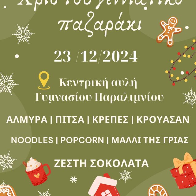 Με πολλή αγάπη και γιορτινή διάθεση, πραγματοποιήθηκε στις 23 Δεκεμβρίου το Χριστουγεννιάτικο Παζαράκι Αγάπης από την Επιτροπή Μαθητικής Πρόνοιας και τον Σύνδεσμο Γονέων και Κηδεμόνων του σχολείου μας.