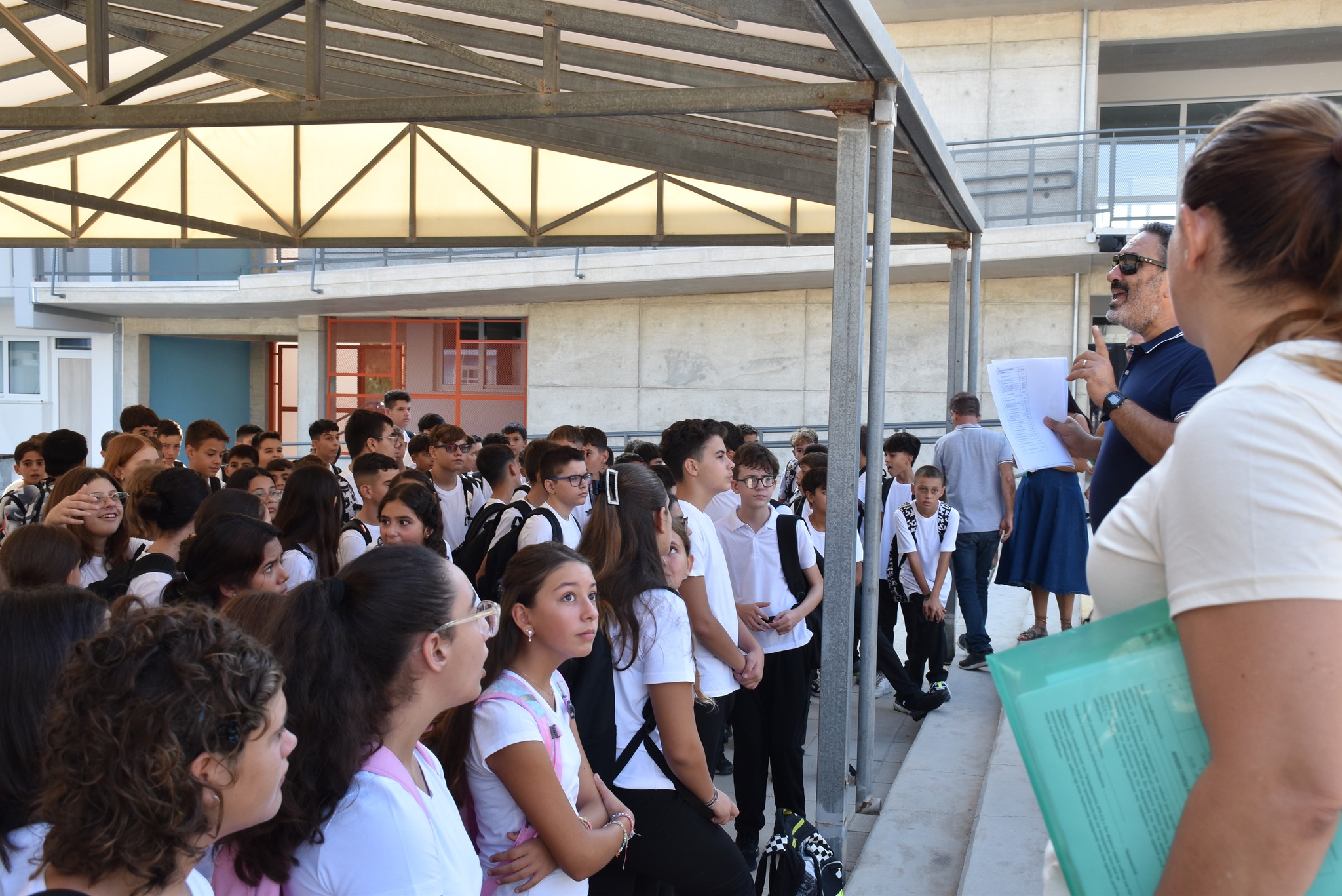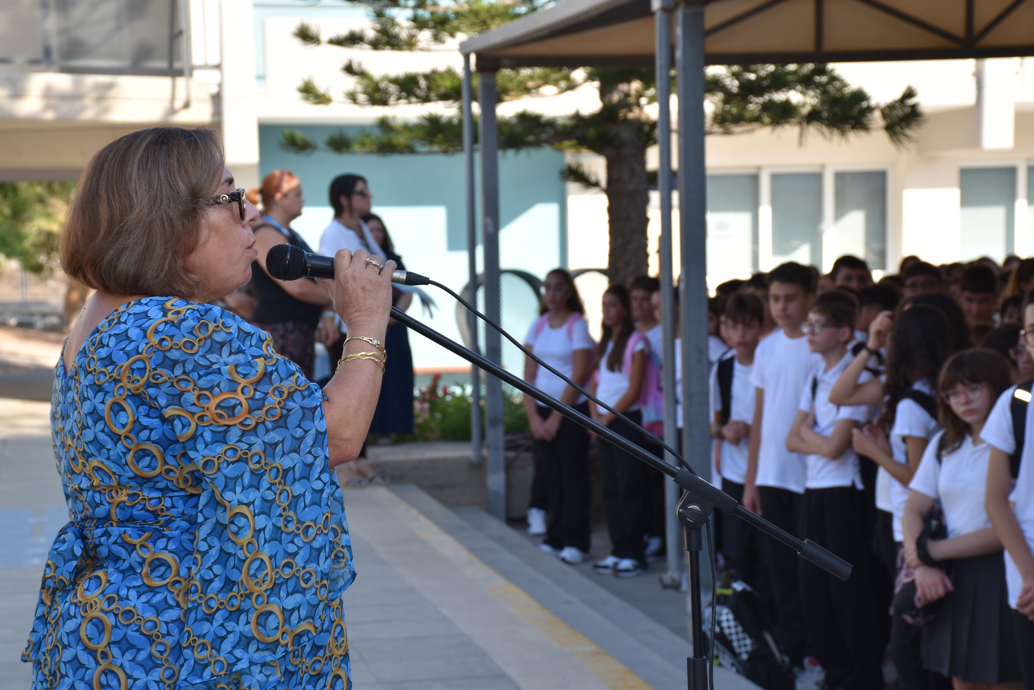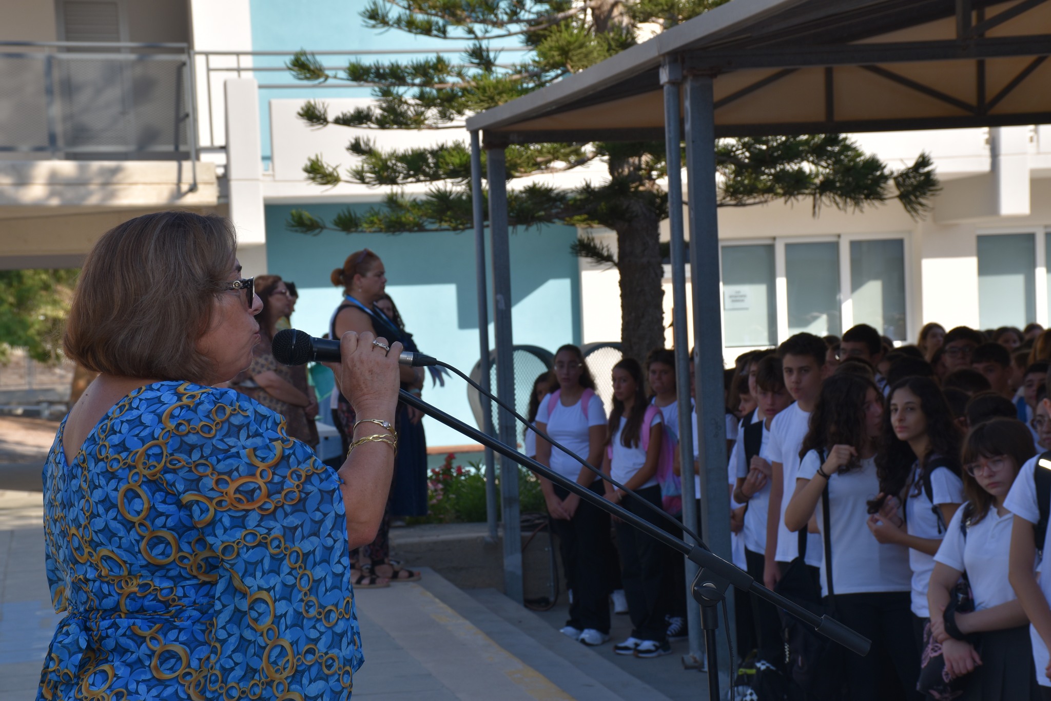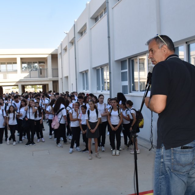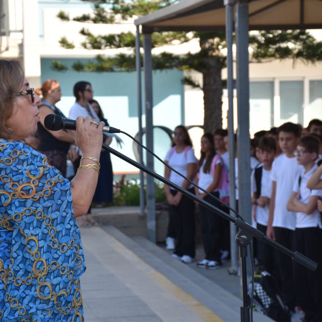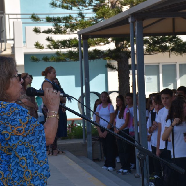 Η Διευθύντρια του σχολείου μας, κα. Ευσεβία Πέκα Αδάμου, απηύθυνε θερμό χαιρετισμό, ενώ στη συνέχεια πραγματοποιήθηκε ο διαχωρισμός των τμημάτων. Οι μαθητές και οι μαθήτριες οδηγήθηκαν στις τάξεις τους, όπου παρέλαβαν τα νέα τους βιβλία.