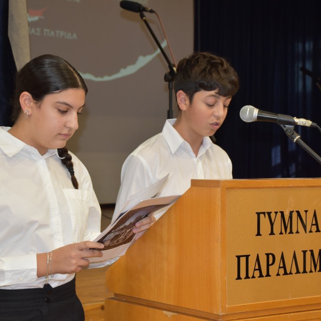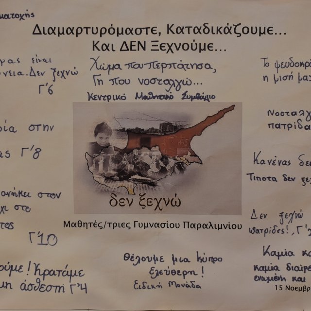 Στις 15/11/2024 οι μαθητές/τριες και οι εκπαιδευτικοί του σχολείου μας συμμετείχαν σε μία δυναμική ενδοσχολική διαμαρτυρία για την επέτειο της ανακήρυξης του Ψευδοκράτους. Μέσα από αυτήν αναδείχθηκε η ανάγκη για ειρήνη, δικαιοσύνη και επανένωση της Κύπρου, στέλνοντας το μήνυμα πως η ιστορική μνήμη παραμένει ζωντανή και η διεκδίκηση δυναμική.